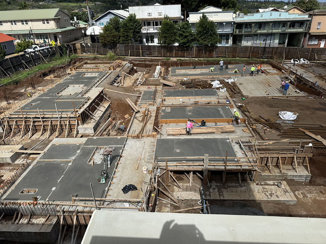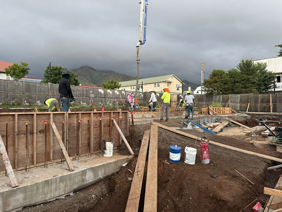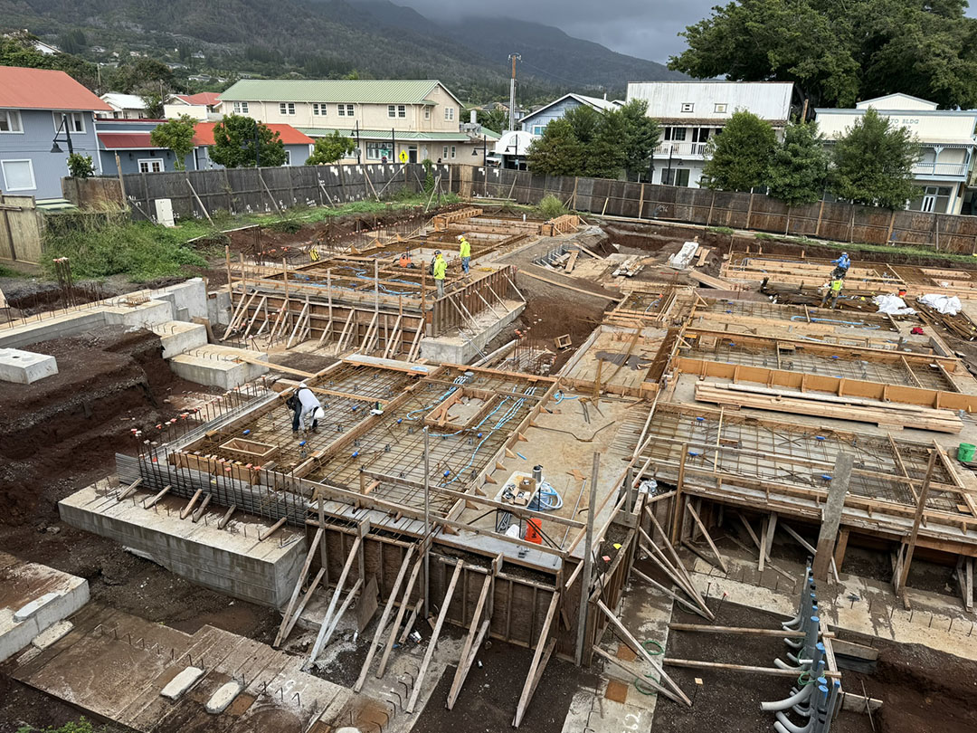 Work at the Hālau of ʻŌiwi Art site continued this week despite weather impacts. Heavy rains over the weekend temporarily paused activity, but crews quickly resumed operations, preparing for and completing the first phase of tilt-up panel pours. Coordination among trades remains strong as structural and utility work progresses.
