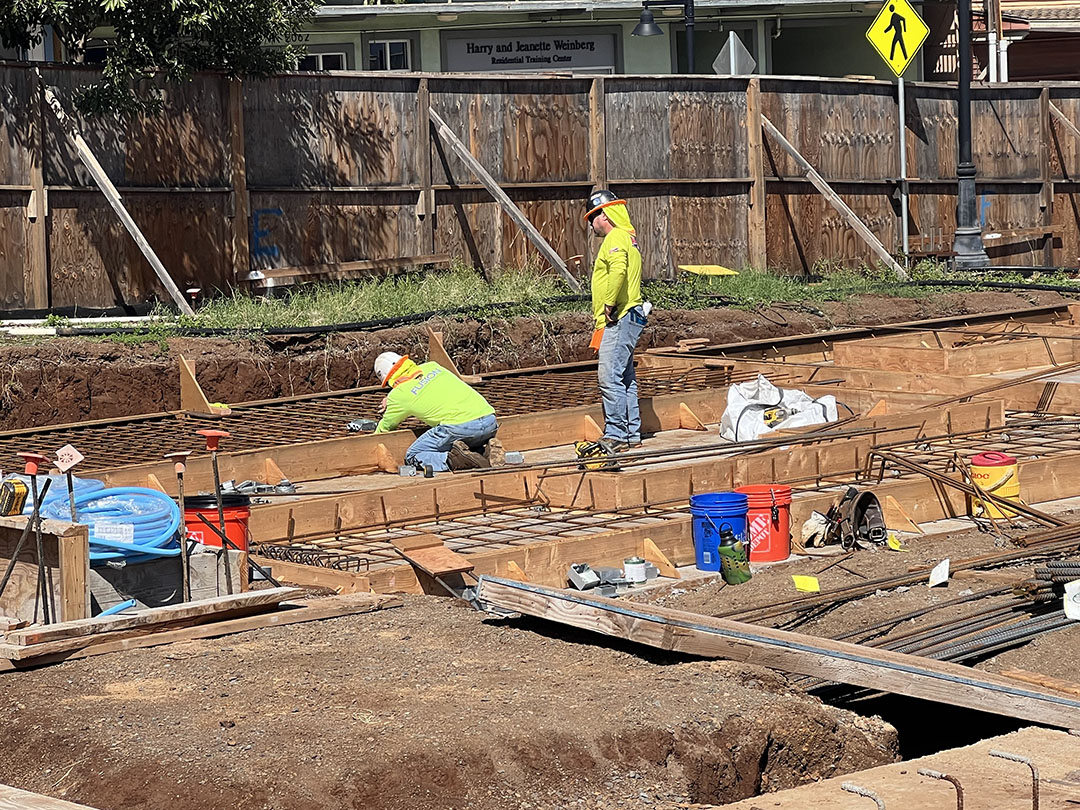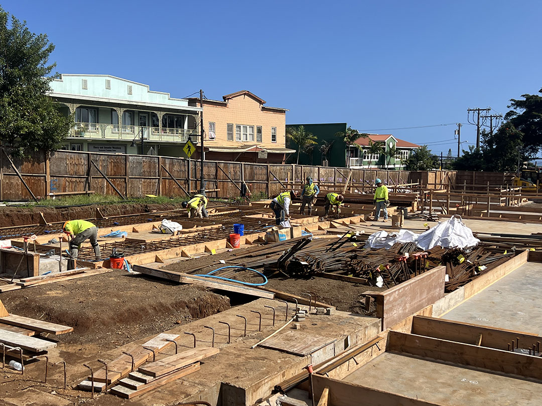 Construction continues to progress at the Hālau of ʻŌiwi Artsite. This week, crews began work on tilt-up panels while advancing structural rebar installation and rough-ins for plumbing and electrical systems. Multiple trades are actively coordinating to keep foundational work moving forward.