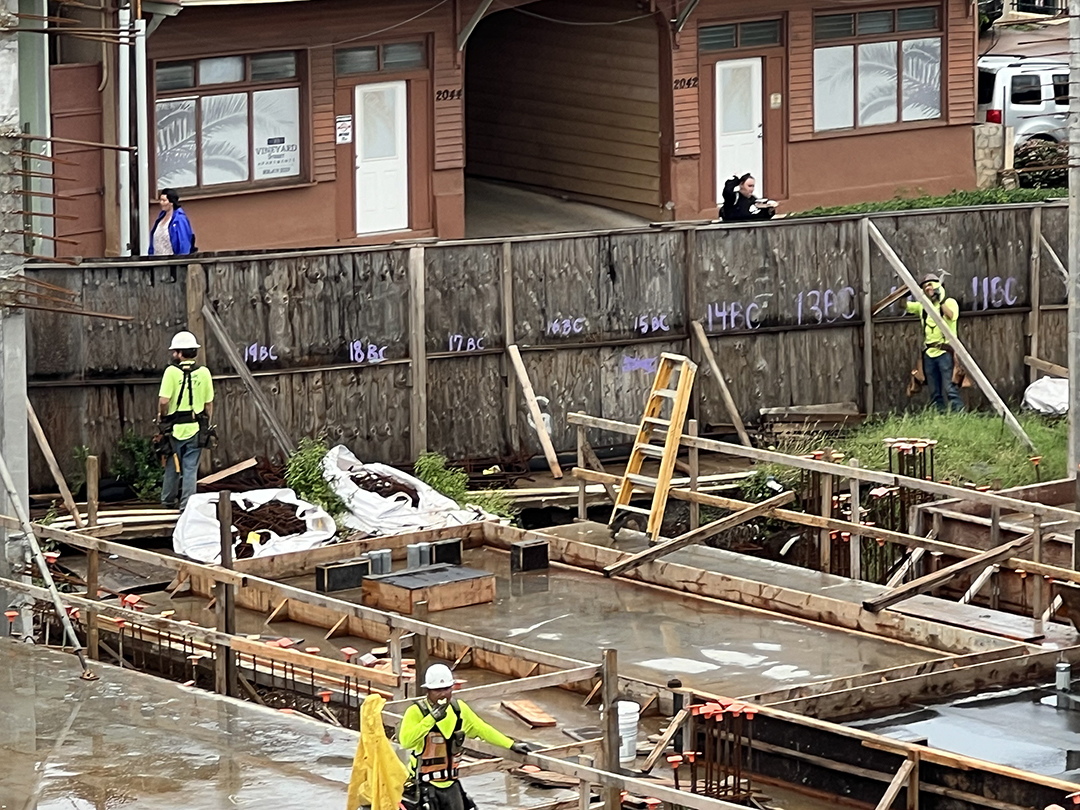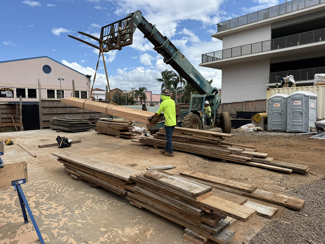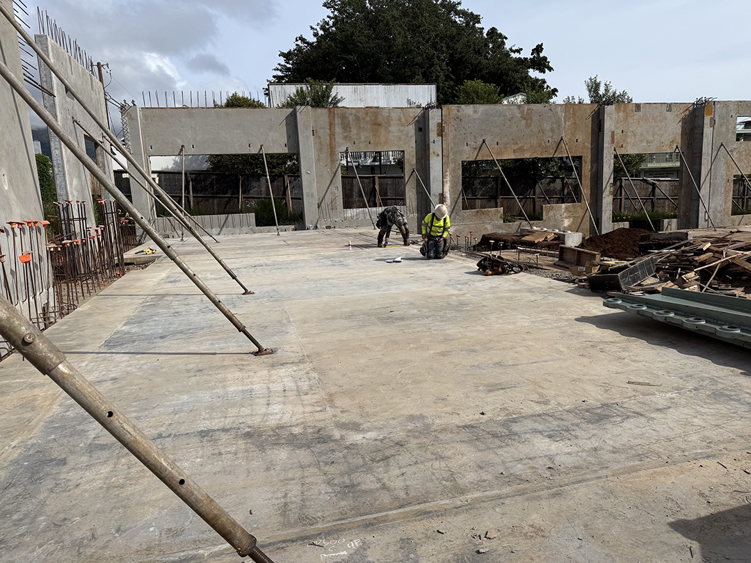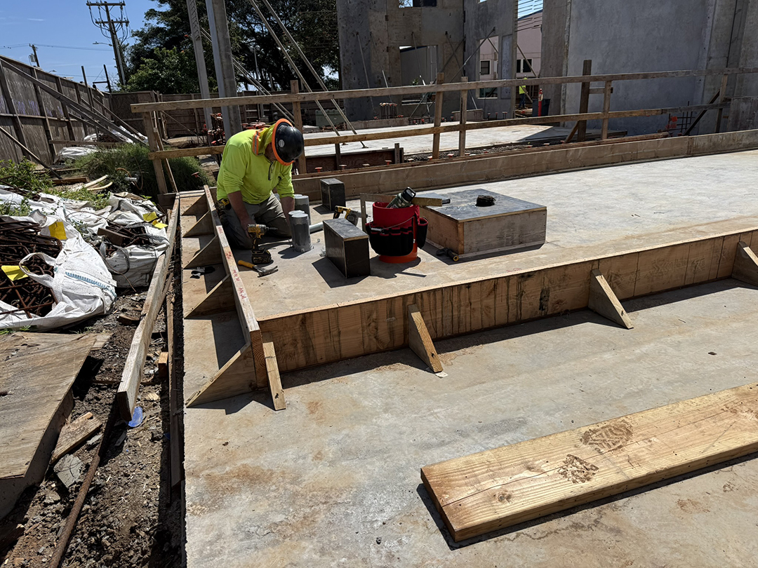 Work at the Hālau of ʻŌiwi Art site progressed into the next phase this week, with crews beginning preparation and forming for the second round of tilt-up panels. Site activity focused on layout, forming, and readiness for upcoming installation, while also addressing safety measures in advance of anticipated weather conditions.
